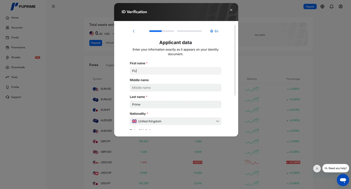 يرجى الدخول إلى موقع التسجيل الخاص بـ PU Prime عبر الرابط https://www.puprime.net/forex-trading-account/ وتعبئة المعلومات المطلوبة. سيحصل العملاء على تفاصيل الوصول إلى بوابة العميل في بريدهم الإلكتروني المسجل بمجرد إتمام هذه الخطوة.