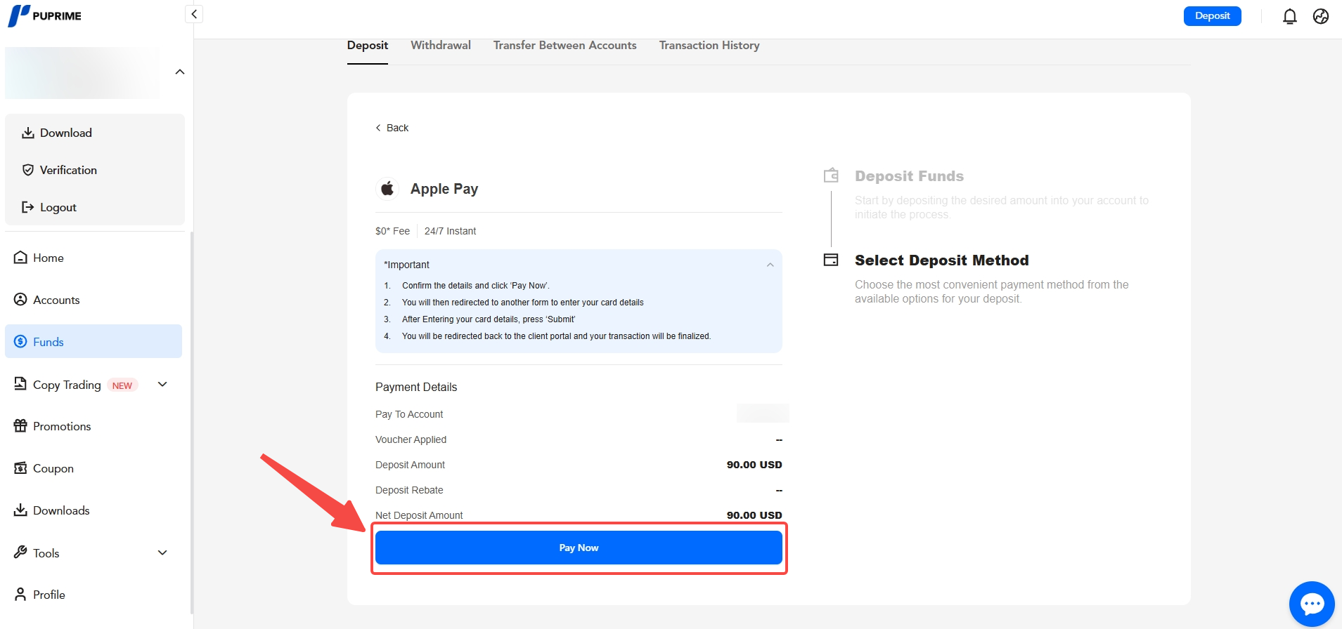 2. Klicken Sie auf "Einzahlung", wählen Sie das Handelskonto aus, das Sie finanzieren möchten, geben Sie den Einzahlungsbetrag ein und klicken Sie auf "Weiter".
