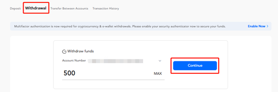 Once you have passed the "Plus" verification, - click "Funds" - select "Withdrawal" and input "Withdrawal Amount" to be withdrawn and click on the "Continue" button.