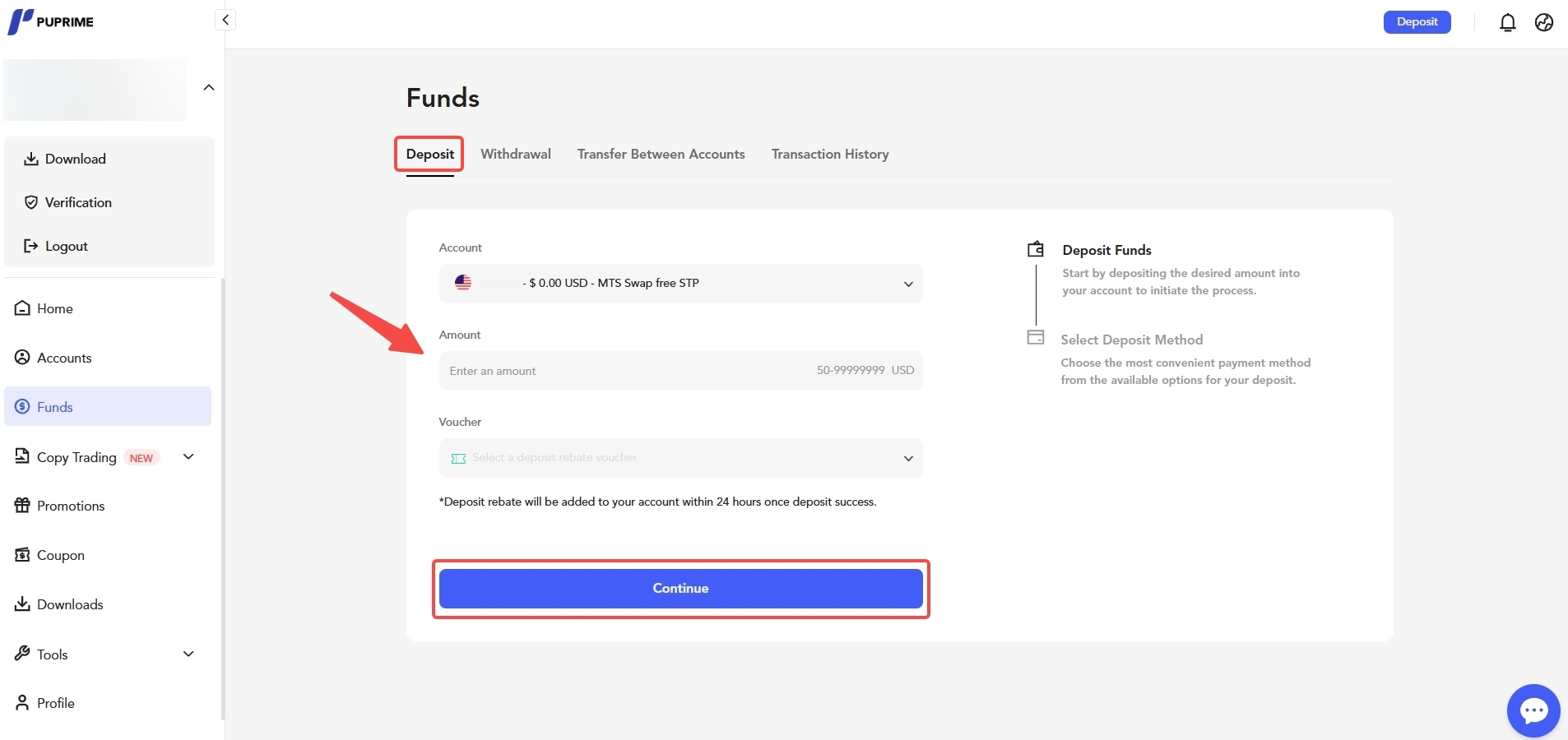 2. Click "Deposit", select the trading account you wish to fund, enter the deposit amount, and click "Continue".