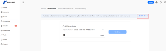 Ang mga kliyente na walang Google play store o Apple app store ay kinakailangang gumamit ng mga authenticator upang magpatuloy sa mga withdrawal sa loob ng account.
