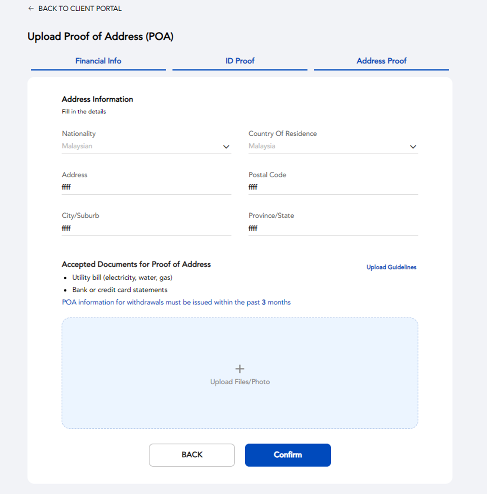 Kasunod nito, punan ang kinakailangang detalye ng pananalapi at magbigay ng patunay ng tirahan (na inisyu sa loob ng huling tatlong buwan) at ang iyong Identification card/passport para sa pagpapatunay bago magpatuloy sa deposito ng International Bank Wire Transfer.