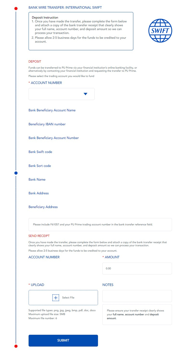 Matapos makumpleto ang pagpapatunay ng pagkakakilanlan, mangyaring punan ang form sa ibaba at mag-attach ng kopya ng resibo ng bank transfer, na tiyak na nagpapakita ng iyong buong pangalan, account number, at halaga ng deposito. Makakatulong ito sa pagpoproseso ng iyong transaksyon. Ang mga pondo ay ibibigay sa iyong MT4/MT5 account sa loob ng humigit-kumulang na 3-5 araw ng negosyo, depende sa aktwal na oras ng pagpoproseso ng bangko.