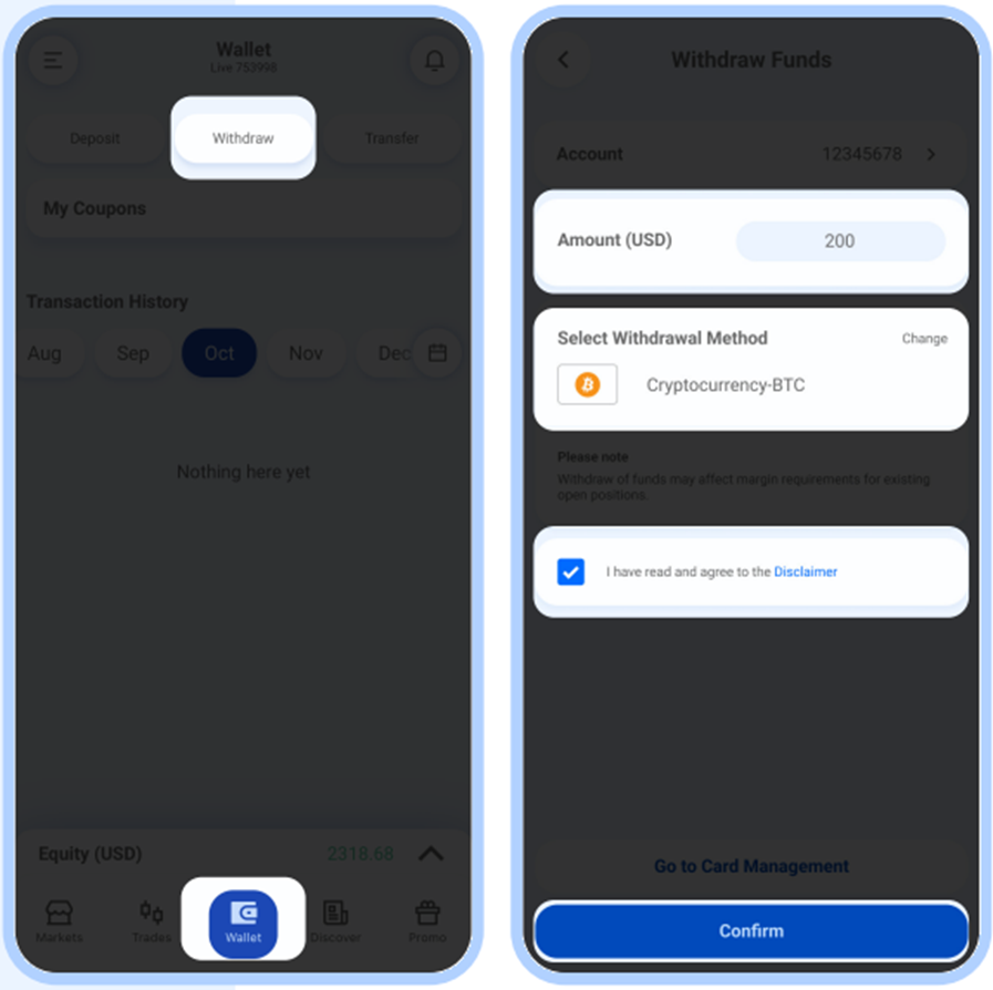 Ipasok ang halaga na nais mong i-withdraw at piliin ang iyong paraan ng pag-withdraw, kasunod ng pagkakasunduan sa Disclaimer. I-click ang ‘Confirm’ para magpatuloy.