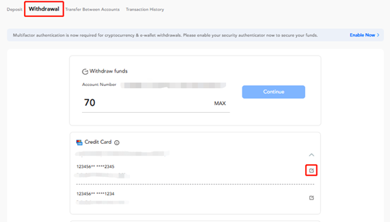 धन शोधन विरोधी नियमों के अनुपालन में, यदि आपने पहले क्रेडिट कार्ड से जमा किया है, तो आपको उसी विशेष कार्ड का उपयोग करके जमा की गई राशि को वापस निकालना होगा। इसलिए आपके निकासी योग्य क्रेडिट कार्ड स्वचालित रूप से चुने जाएंगे। हालांकि, यदि विशेष कार्ड किसी कारण से अब उपयोग में नहीं है, तो आपके पास क्रेडिट कार्ड को संग्रहीत करने का विकल्प है।
