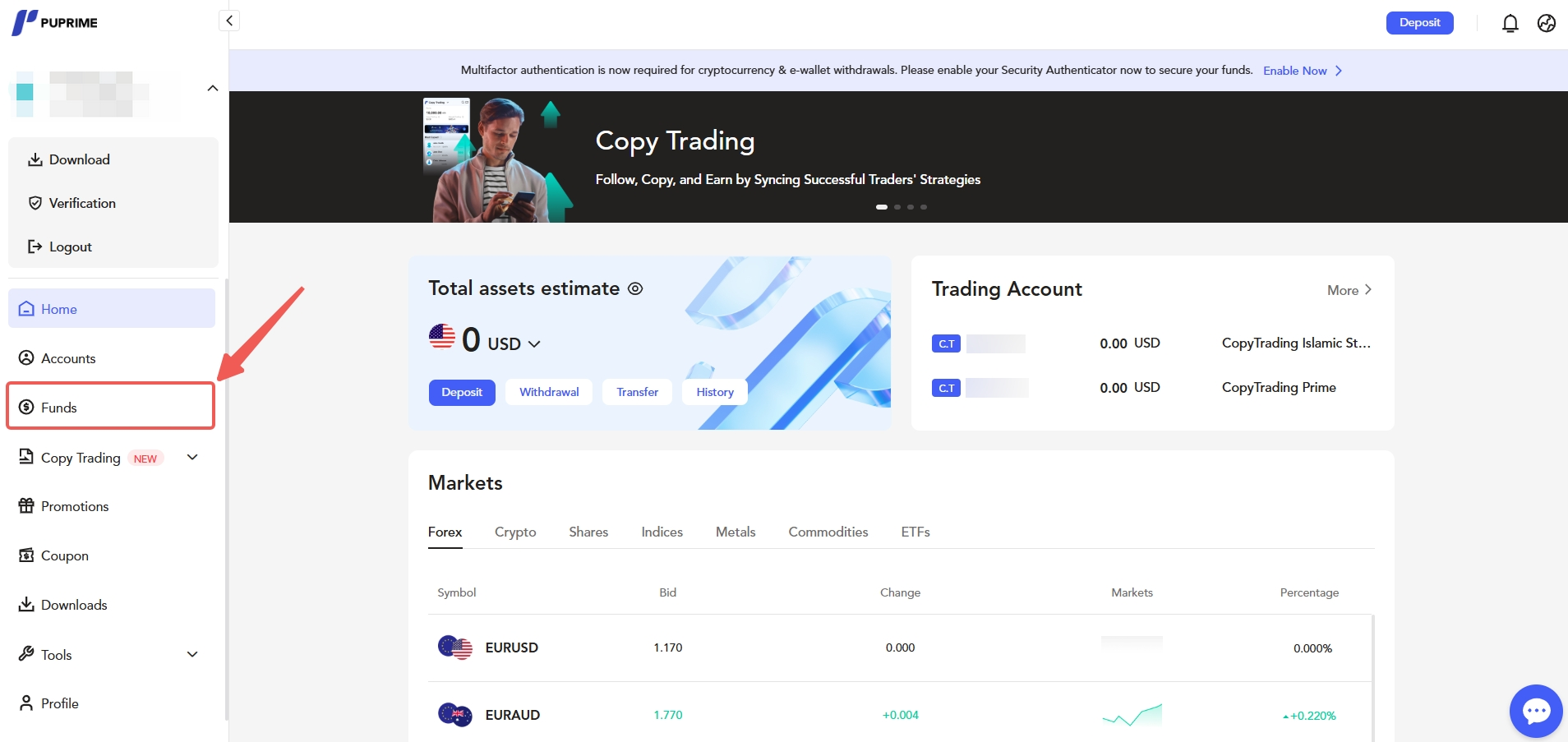 1. क्लाइंट पोर्टल में लॉग इन करें और "Funds" पर जाएं।