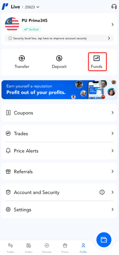 Help Center | PU Prime | More Than Trading Aplikasi PU Prime? Permintaan Aplikasi PU Prime Bagaimana cara menarik dana? 1. Klik tombol "Profile". 2. Klik tombol "Funds". 3. Klik "Withdraw" untuk melanjutkan permintaan penarikan Anda. 4. Pilih akun Anda dan jumlah penarikan Anda, lalu klik "Next".