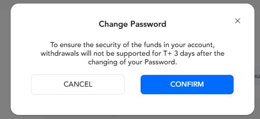 Per garantire la sicurezza dei fondi nel tuo conto, i prelievi non saranno supportati per T+ 3 giorni dopo la modifica della tua password. Seleziona "conferma" per procedere con la modifica della password.