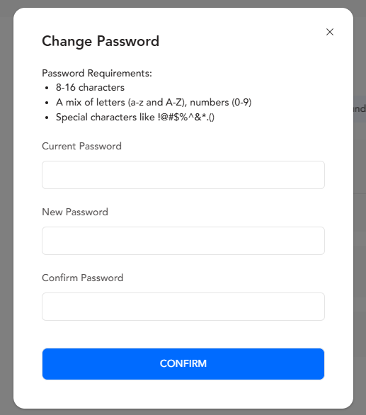 Ai clienti è richiesto di inserire le password attuali e di crearne di nuove in base ai requisiti di password. Seleziona "Conferma" per finalizzare il cambio di password.