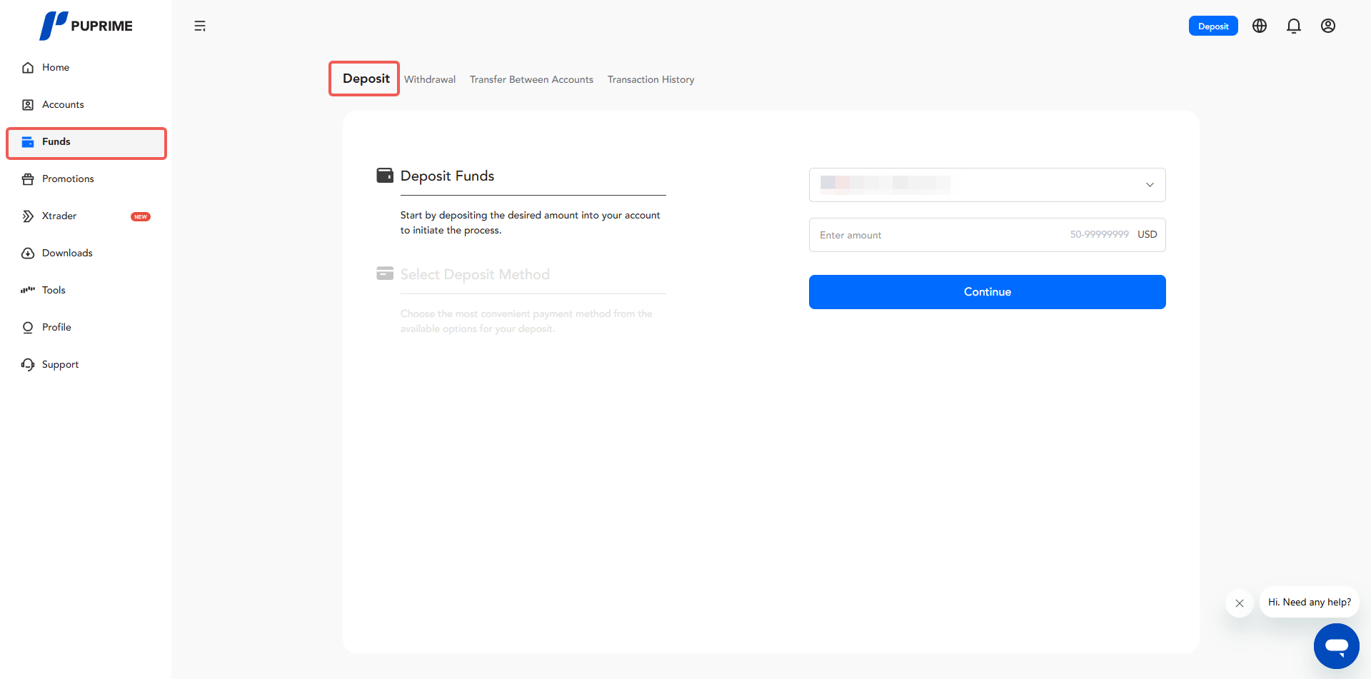 資金を入金するには、クライアントポータルにログインし、「資金」をクリック – 「入金」を選択 – 取引口座番号を入力し、ご希望の入金額を選択して「続行」をクリックしてください。