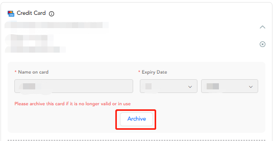 クレジットカードをアーカイブするには、「出金」ページで引き出し金額を入力した後、クレジットカードが表示されます。以下のボタンをクリックしてクレジットカードをアーカイブしてください。