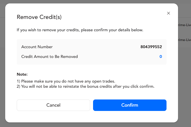 Help Center | PU Prime | More Than Trading 계정 관리 클라이언트 포털 내 계좌에 크레딧이 존재할 경우 자금을 어떻게 이체하나요? 크레딧 보너스가 있는 계좌는 내부 이체가 불가능합니다.크레딧을 제거하려면 대시보드 메뉴에서 "계좌관리" 를 클릭한 후 버튼을 선택합니다. 그러면 "크레딧 제거" 메뉴가 표시됩니다. 제거할 크레딧 금액을 확인합니다. 크레딧이 성공적으로 제거되면 대시보드 메뉴에서 "자금"을 클릭한 후 "자금 이체"를 선택하여 내부 이체를 진행할 수 있습니다. *참고: 크레딧을 제거할 수 없는 경우, 라이브 채팅 또는 고객 지원팀에 문의하시기 바랍니다.