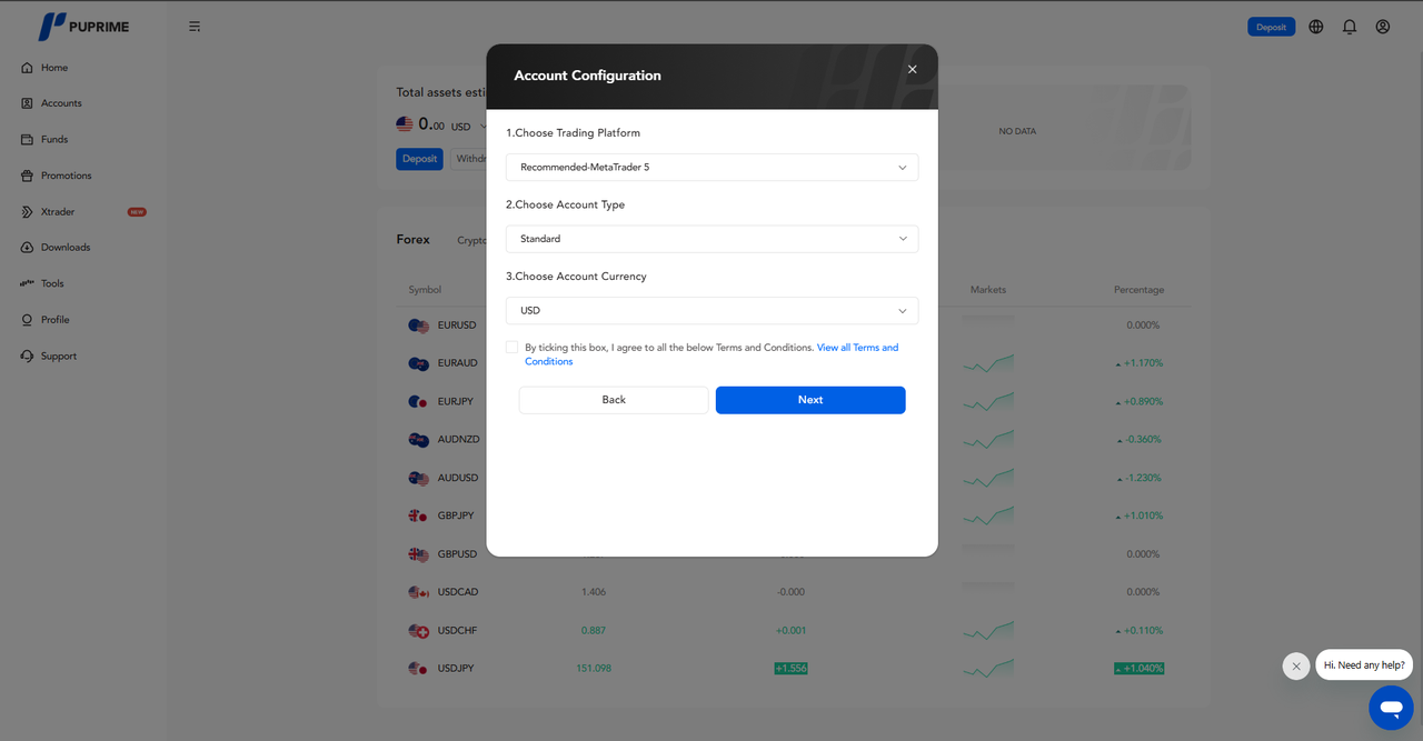 Dalam bahagian "Account Configuration", pilih platform dagangan, jenis akaun, dan mata wang akaun yang diingini. Baca dengan teliti Terma dan Syarat, tandakan kotak untuk bersetuju, dan klik butang "Next" untuk seterusnya.