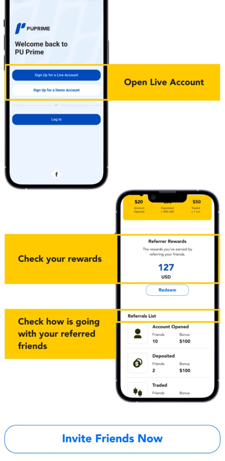 Help Center | PU Prime | More Than Trading PU Prime App Pertanyaan Aplikasi PU Prime Bagaimana untuk merujuk seorang rakan? 1. Ketik pada butang "Profile". 2. Ketik pada butang "Referrals". 3. Ketik "Invite Friends Now". 4. Salin dan kongsi kod rujukan atau kod QR anda.