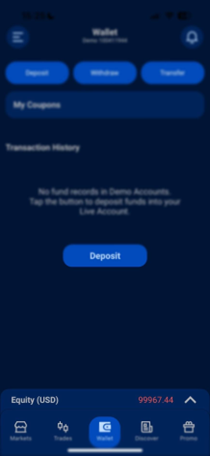 Kliknij na "Wallet" na dole paska nawigacyjnego, a następnie kliknij "Deposit".