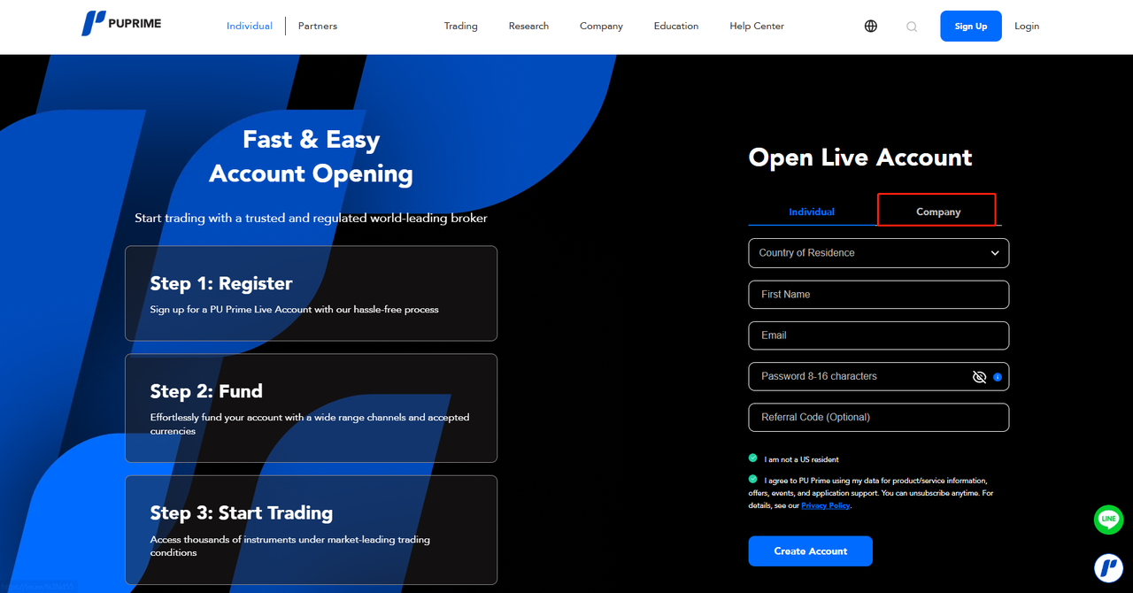 Если вы хотите подать заявку на открытие корпоративного счета, пожалуйста, перейдите на сайт регистрации PU Prime по адресу https://www.puprime.net/forex-trading-account/ и выберите "Company Account".