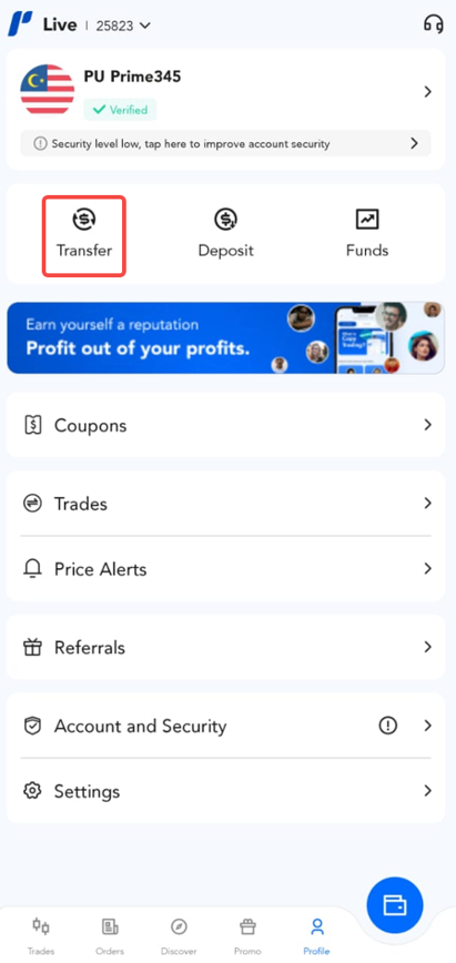 Help Center | PU Prime | More Than Trading приложении PU Prime Запрос приложения PU Prime Как выполнить перевод средств? 1. Нажмите на кнопку "Profile". 2. Нажмите на кнопку "Transfer". 3. Введите данные для перевода средств и нажмите "Далее", чтобы продолжить перевод средств.
