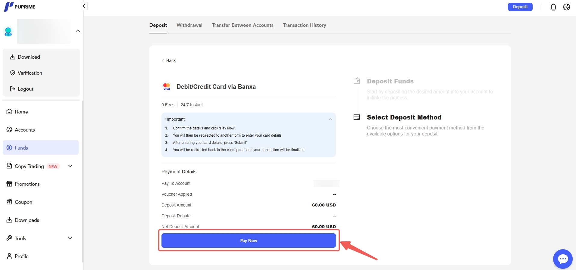 Nếu bạn đã nạp tiền thành công nhưng số tiền chưa xuất hiện trong tài khoản của bạn trong khoảng thời gian dự kiến, hoặc nếu bạn không thể nạp tiền, vui lòng liên hệ với chúng tôi qua Live Chat hoặc gửi email tới info@puprime.com sử dụng địa chỉ email đã đăng ký của bạn để được hỗ trợ thêm. Vui lòng bao gồm các thông tin sau trong tin nhắn của bạn: