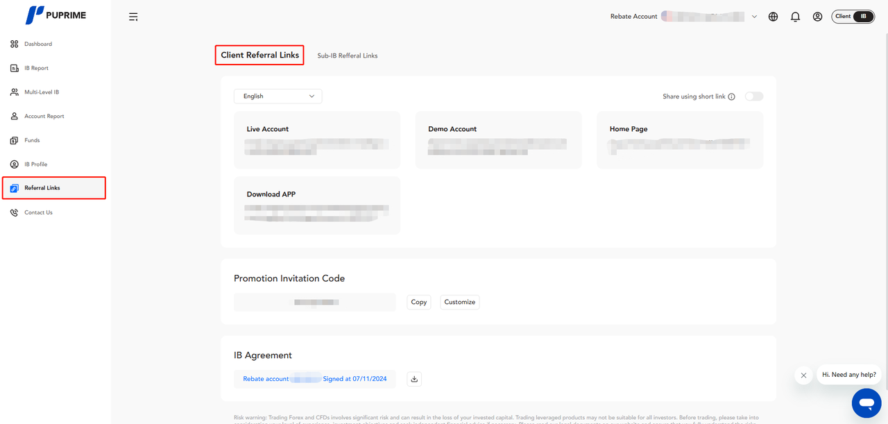 帮助中心 | PU Prime | More Than Trading Partnership IB 我在哪里可以获取我的IB推荐链接给客户? 介绍经纪人在登录其IB专区后,可以在“仪表板”上获取其IB推荐链接和用于客户的推广邀请码。 另外,介绍经纪人也可以通过“推荐链接”获取他们的IB推荐链接和促销邀请码,以便客户使用。 注意: IB可以使用推荐链接页面右上角的共享短链接功能,以更好地保护他们的共享链接,防止被他人更改。 IB可以自定义他们的推广邀请码为首选的邀请码(只能输入字母、数字、非特殊符号)