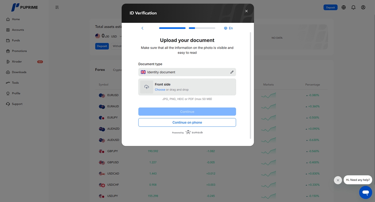 - 在「上傳您的文件」部分,上傳您的身份證正面並點擊「繼續」。